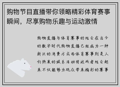 在当今的数字时代,购物直播已经成为一种新兴的消费方式,而体育赛事则是人们热衷的娱乐活动。将这两者结合起来,不仅能够为观众带来精彩的赛事瞬间,还能让他们在观看比赛的同时享受购物的乐趣。本文将从多个方面探讨购物节目直播如何带领观众领略精彩的体育赛事瞬间,尽享购物乐趣与运动激情。