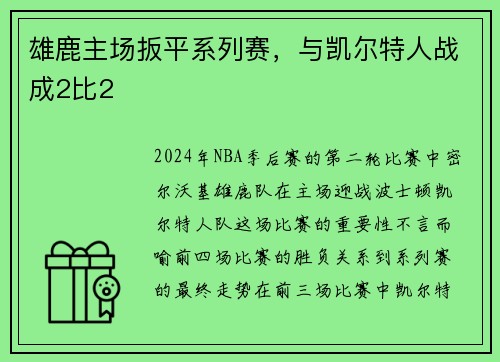 2024年NBA季后赛的第二轮比赛中,密尔沃基雄鹿队在主场迎战波士顿凯尔特人队。这场比赛的重要性不言而喻,前四场比赛的胜负关系到系列赛的最终走势。在前三场比赛中,凯尔特人队率先取得了2比1的领先优势,给雄鹿队带来了不小的压力。雄鹿队并未气馁,而是在主场拼尽全力,最终成功将系列赛扳成2比2平。