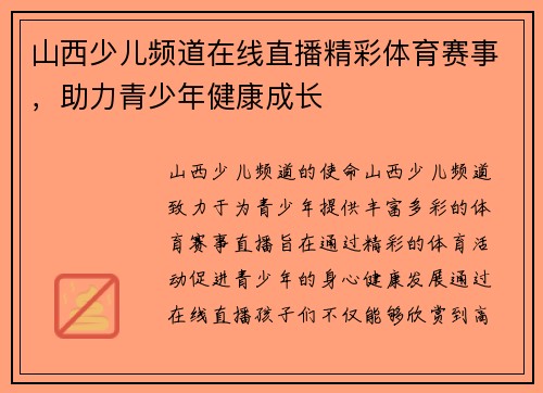 在这篇文章中,我们将从四个方面详细探讨山西少儿频道在线直播精彩体育赛事的意义。首先,我们将分析体育赛事对青少年身体素质的提升,其次,探讨体育赛事对青少年心理健康的积极影响,接着,讨论体育赛事在培养团队精神和社交能力方面的作用,最后,我们将关注山西少儿频道如何通过直播活动增强青少年的参与感和归属感。